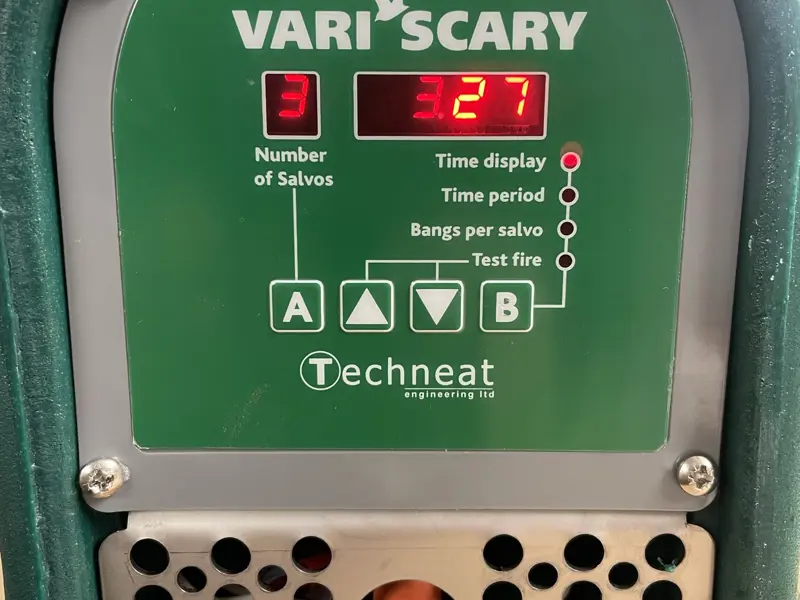 The day is divided up into 30 minute time periods from 0500 - 2100. To program, you simply cycle through the time periods, programming how many salvos you require within that time period (either zero, one, two, three or random). You then have the option of programming how many "bangs" per salvo - (again either one, two, three or random). This gives you complete variability throughout the day and makes adjustments in line with daylight hours quick and easy. To finish off you can carry out a test fire to ensure everything is firing as it should!