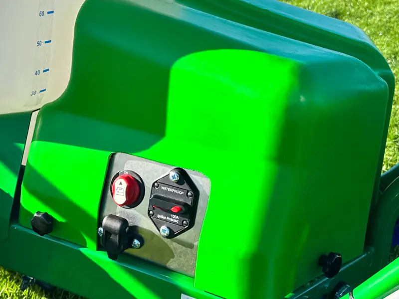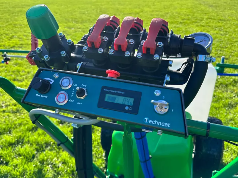 All controls whether linked to the spray or drive operations are at the operators finger tips, a neatly constructed console houses the main on off switch (key), direction and pump activation switches, along with a battery condition indicator.